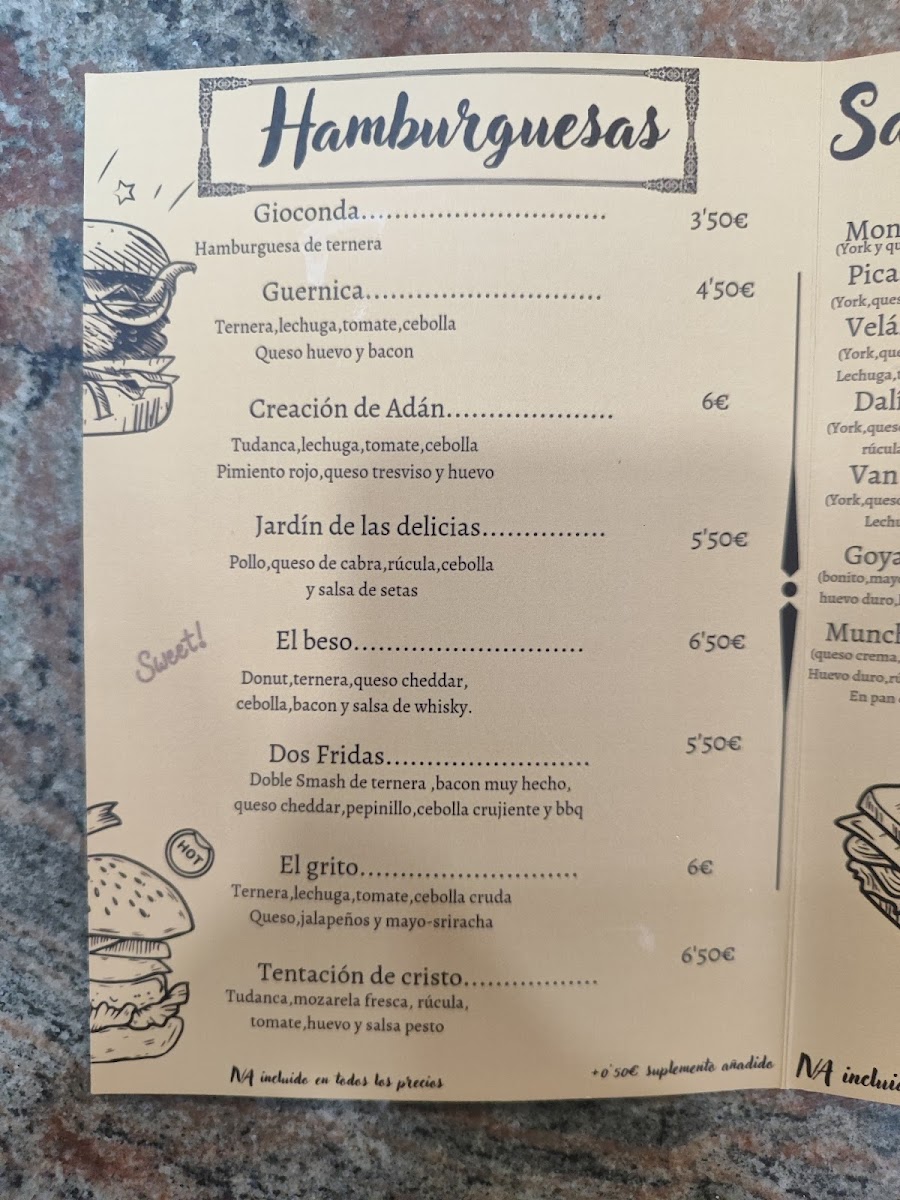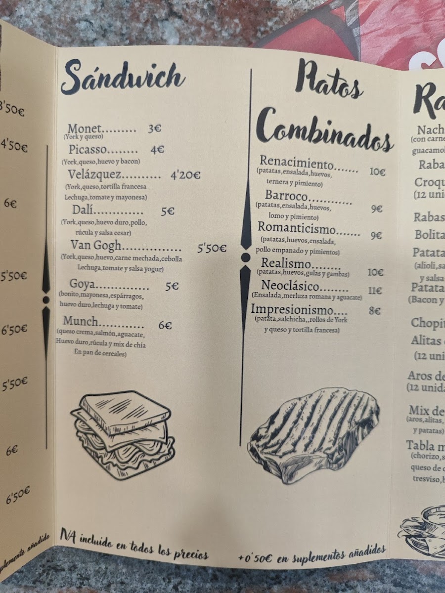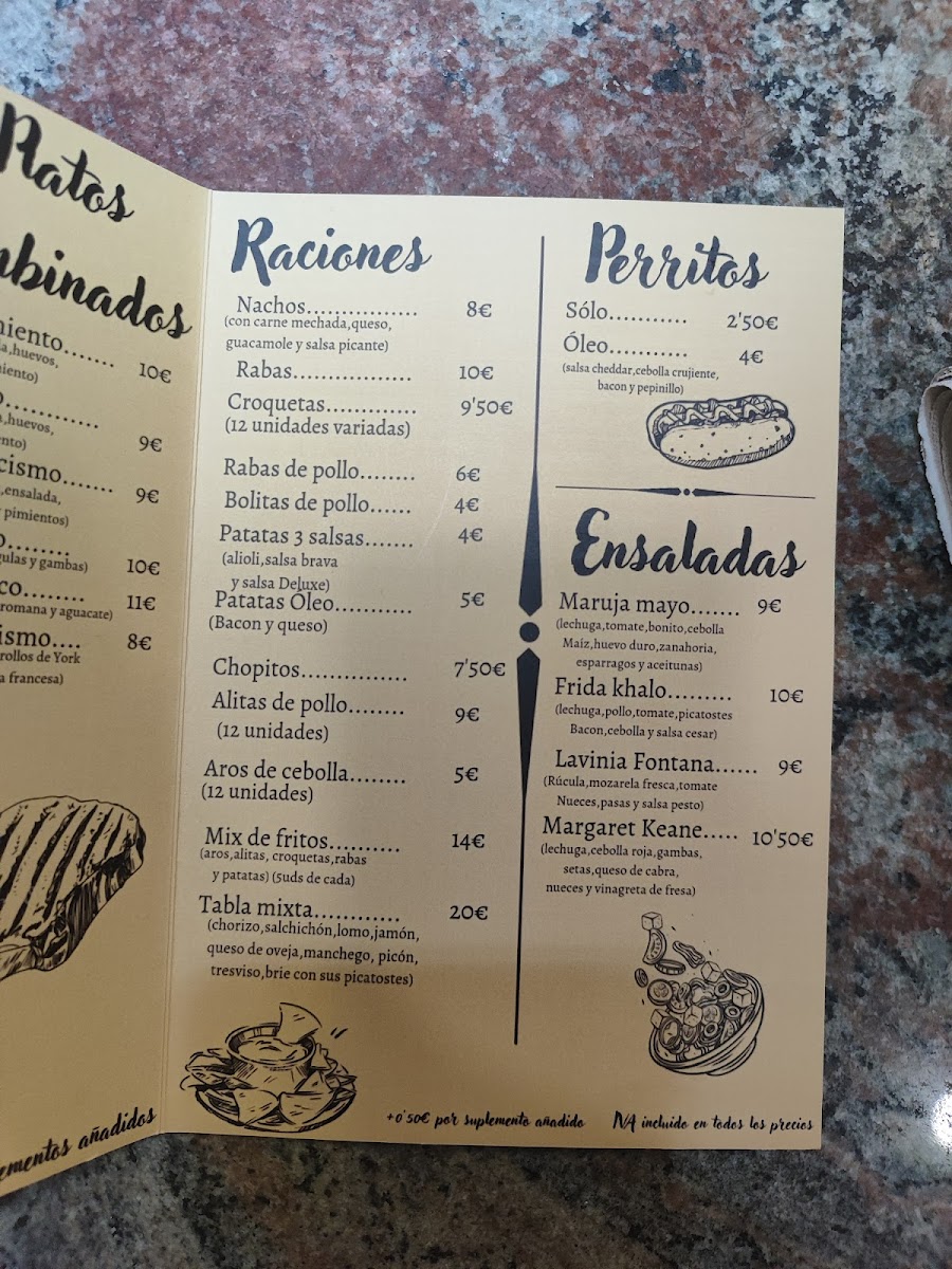 Salad lovers will find joy in the Ensalada César (€10.40), a vibrant mix of lettuce, crispy chicken, and creamy yogurt dressing, while the Ensalada Mixta brings together fresh vegetables and savory tuna for a lighter, yet equally satisfying choice.